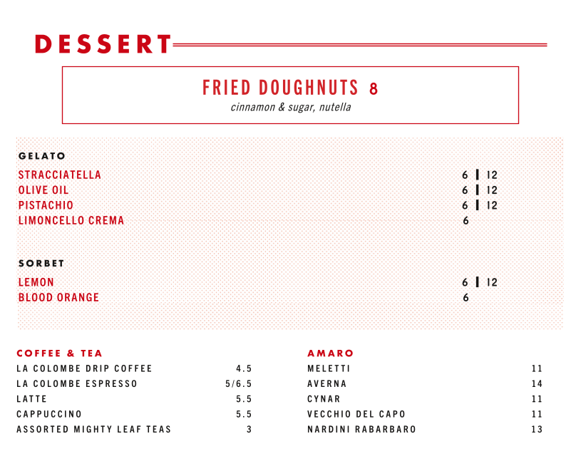 - Pastas: Classic Italian pasta dishes, including Spaghetti Pomodoro, Bucatini Cacio E Pepe, Beef Bolognese, Rigatoni Alla Vodka, and Shrimp Scampi.