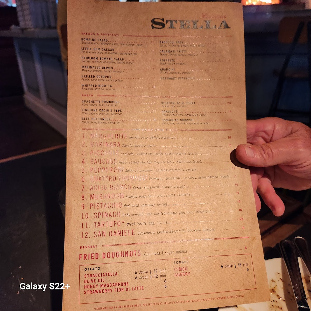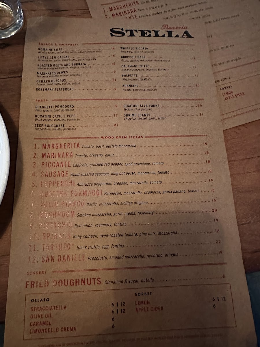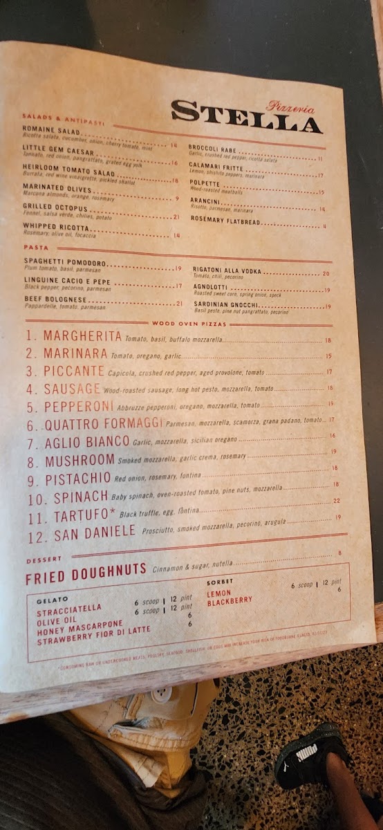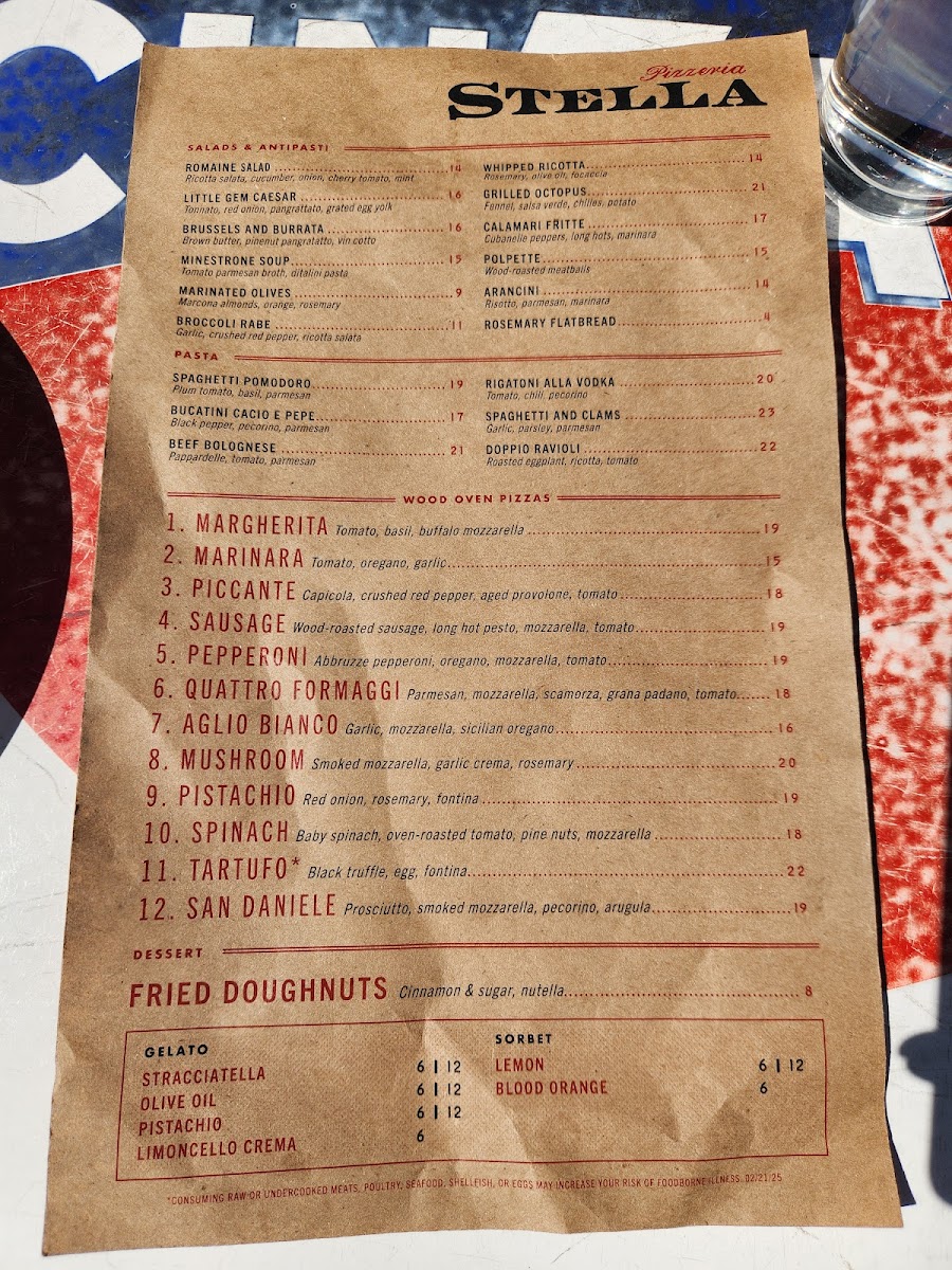The menu at Pizzeria Stella offers a variety of Italian dishes with a strong focus on wood-fired pizzas and traditional pasta preparations. It is suitable for lunch, casual dining, or takeout, with options that cater to both quick orders and more relaxed meals.