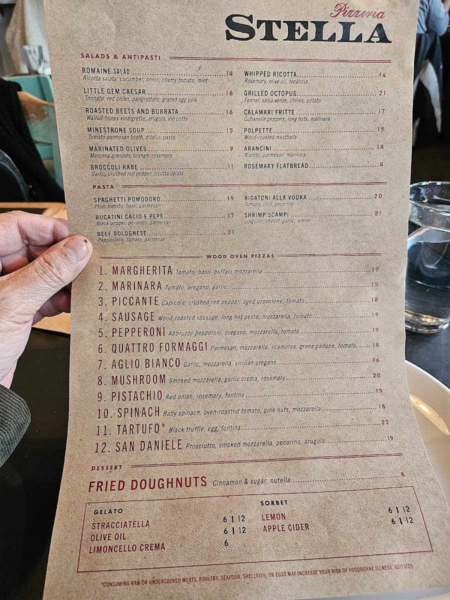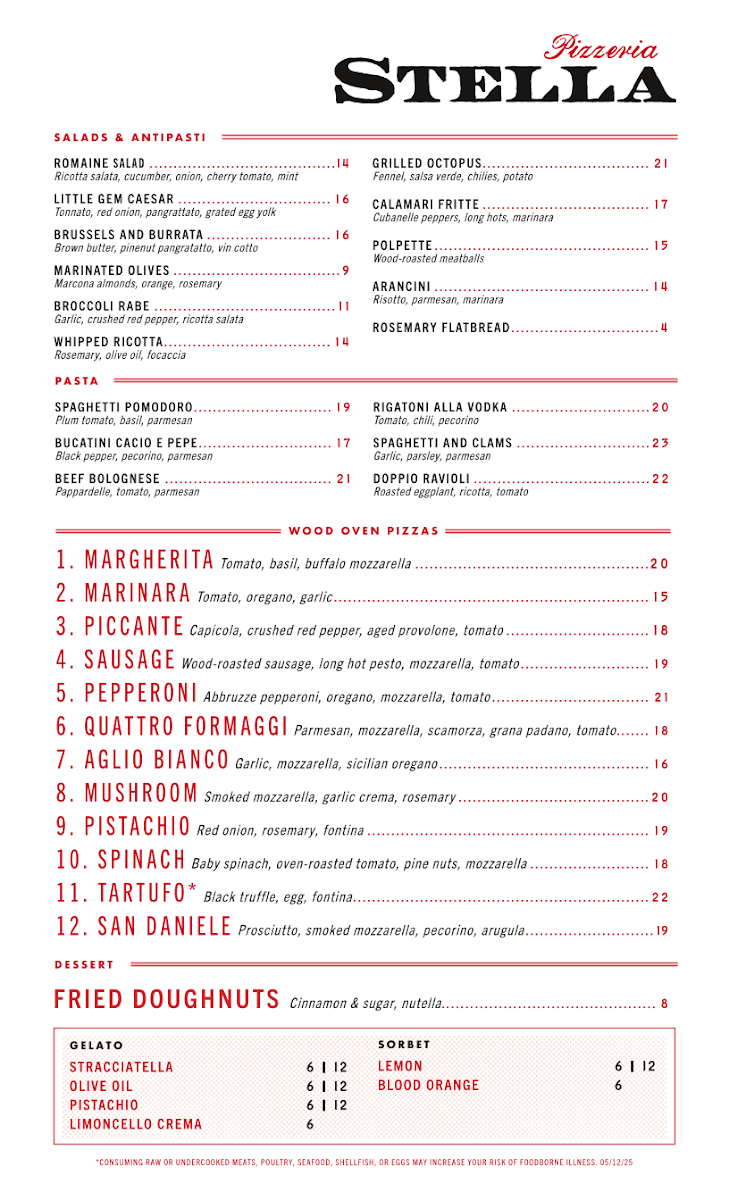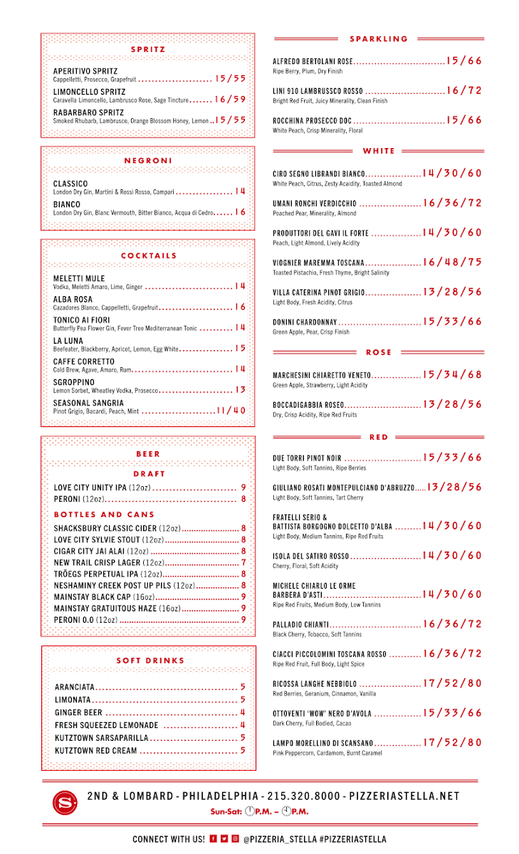 The menu at Pizzeria Stella offers a variety of Italian dishes with a strong focus on wood-fired pizzas and traditional pasta preparations. It is suitable for lunch, casual dining, or takeout, with options that cater to both quick orders and more relaxed meals.
