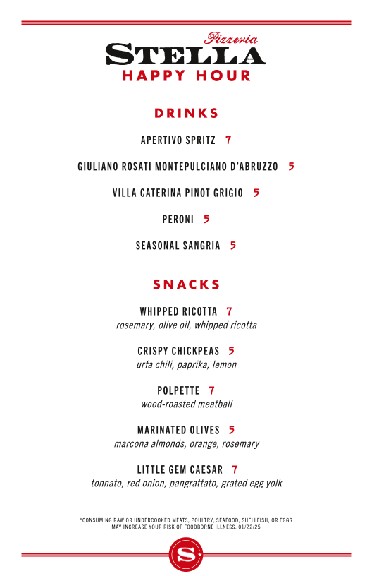 - Happy Hour Drinks and Snacks: A selection of beverages such as Aperitivo Spritz, Giuliano Rosati Montepulciano D’Abruzzo, Villa Caterina Pinot Grigio, Peroni beer, and Seasonal Sangria. Snack options include whipped ricotta, crispy chickpeas, wood-roasted meatballs, and marinated olives.