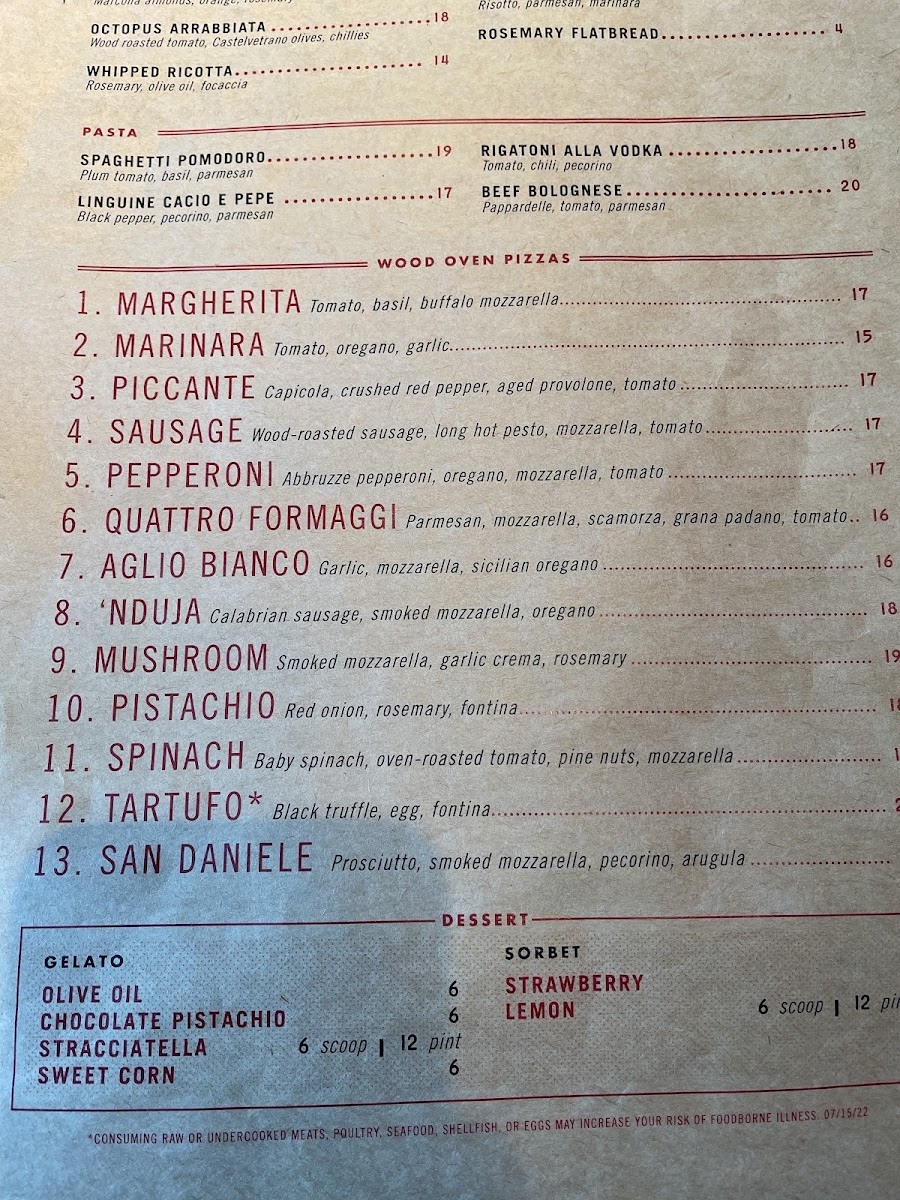 - Pizzas: A diverse pizza selection featuring options like Pepperoni Pizza, Margherita Pizza, Aglio Bianco Pizza, Tartufo Pizza, Sausage Pizza, Spinach Pizza, and specialty items such as Rosemary Flatbread. These pizzas are cooked in a wood-fired brick oven and offer a range of toppings and styles.